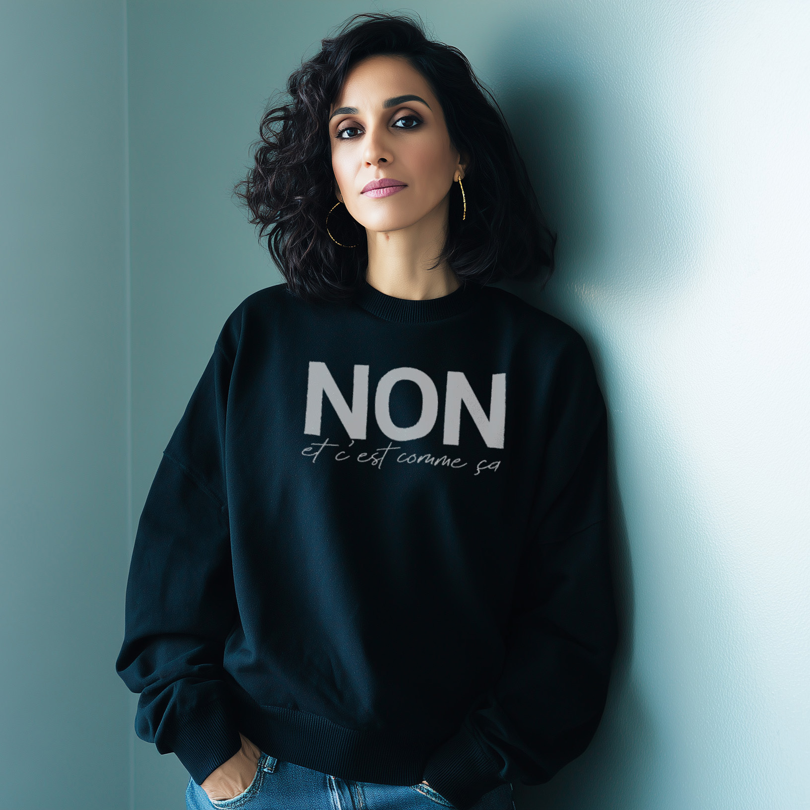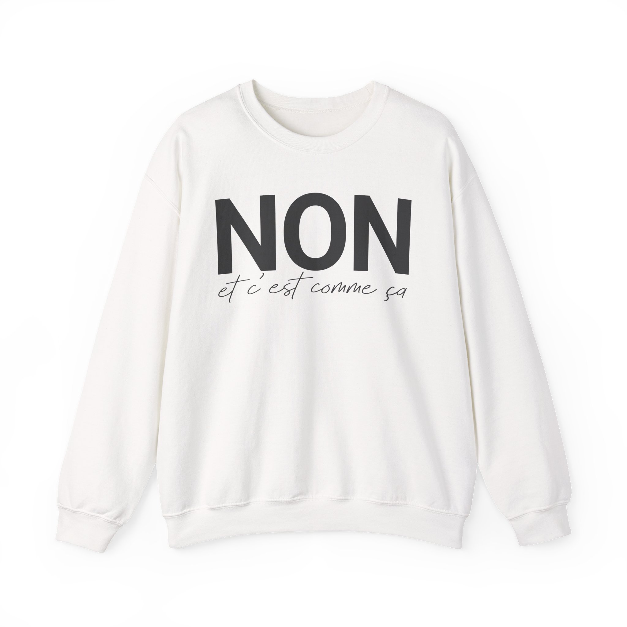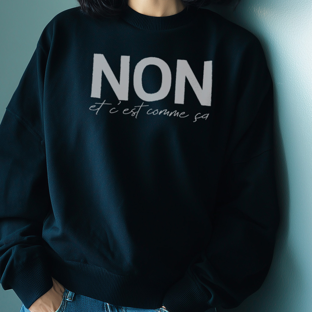 This sweatshirt has been created for women who adore expressive French style. The message “NON Et c’est comme ça” has been printed to deliver bold personality. A mix of cursive and bold characters has been used for visual impact. The design has been crafted to reflect confident Parisian energy. This sweatshirt has been prepared for women who enjoy strong French expressions.