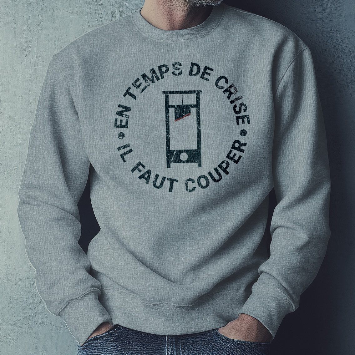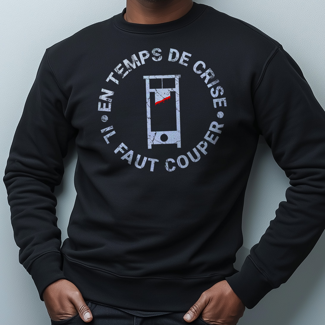 Express your bold personality with this unique men’s French graphic sweatshirt featuring the powerful phrase “En Temps de Crise Il Faut Couper” alongside a striking guillotine illustration. Designed for those with a love of French history, culture, and wit, this sweatshirt makes a strong statement of individuality and sharp critique. Whether you are a proud Francophile, a history enthusiast, or simply someone who appreciates statement apparel with meaning, this sweatshirt will undoubtedly spark conversation wherever you go. Product features – Made without side seams for a smooth, attractive look. – Ribbed collar retains its shape and adds elasticity. – Crafted for adults, meeting all safety compliance standards. – Durably constructed with double-needle stitching for long-lasting wear. – Ethically made with 100% US cotton, ensuring a sustainable choice. Care instructions – Machine wash: cold (max 30C or 90F) – Non-chlorine: bleach as needed – Tumble dry: low heat – Do not iron – Do not dryclean