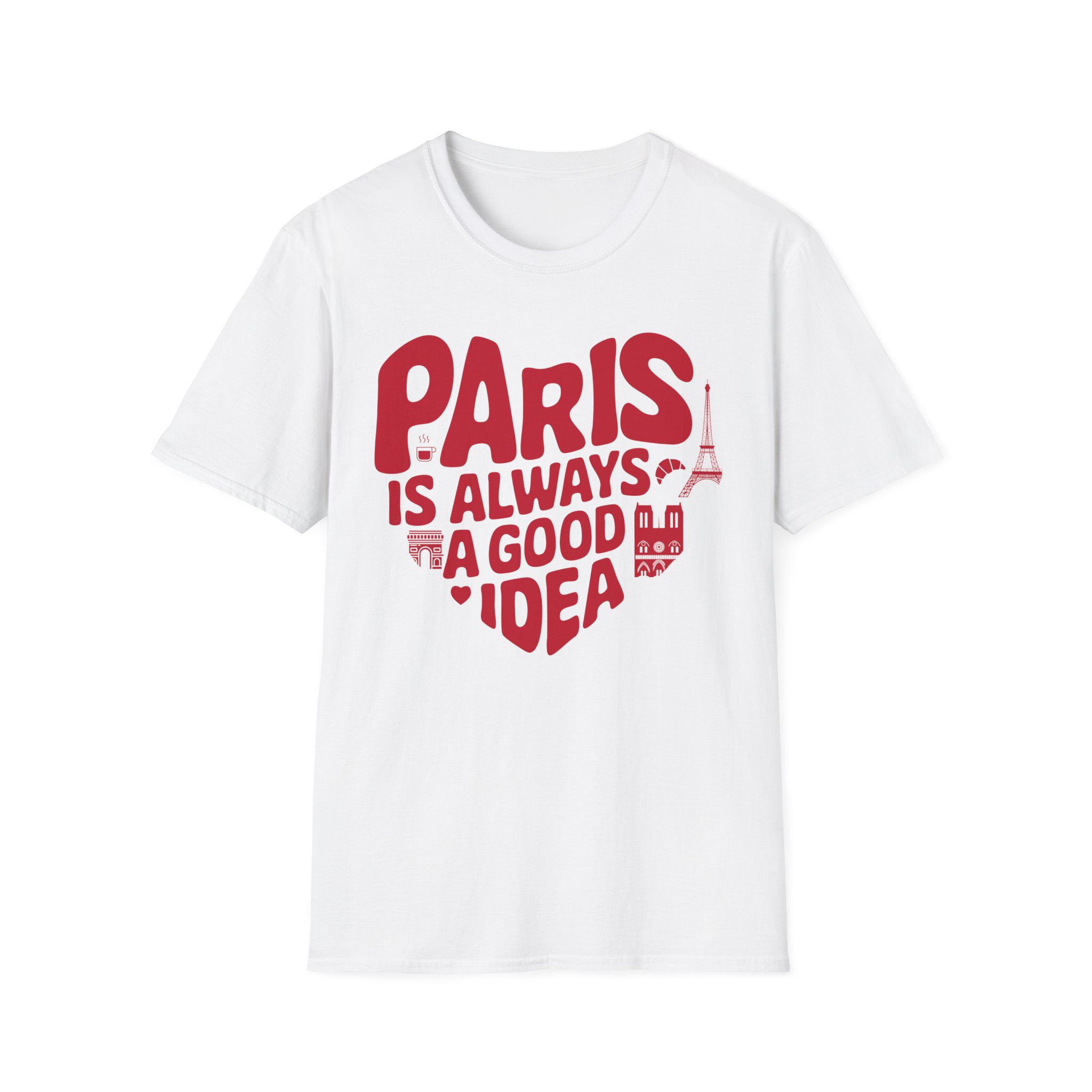 A love for Paris is beautifully expressed through this chic white women’s T-shirt. The design is inspired by timeless French romance. The words “Paris is always a good idea” are displayed in a heart shape filled with Parisian icons. Every detail has been designed to reflect the city’s elegance.